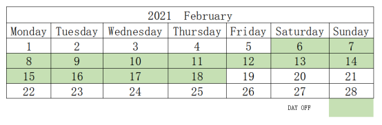 lease note that our company will be closed for the Chinese New Year celebration from 2.6 until 2.18 ,2021. Normal business will resume on 2.19 ,2021.